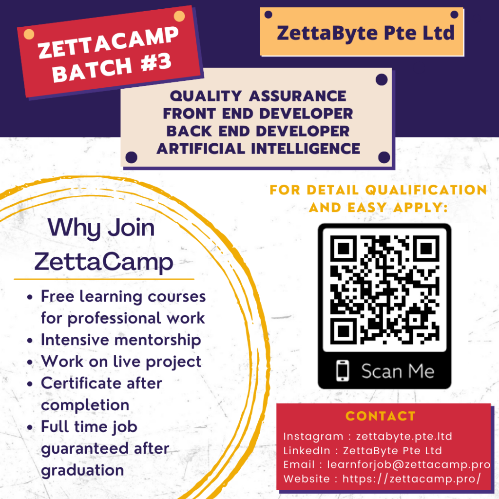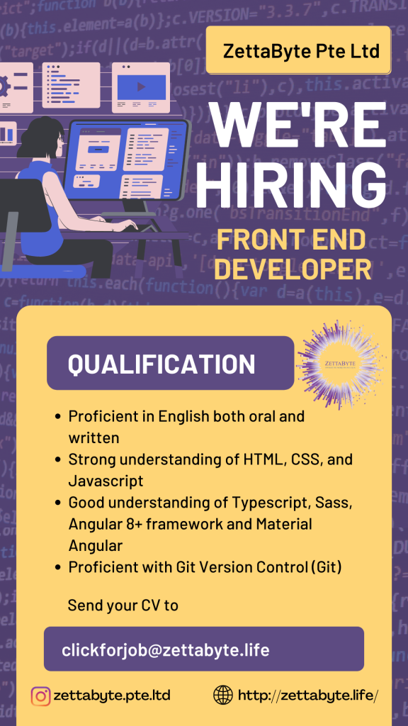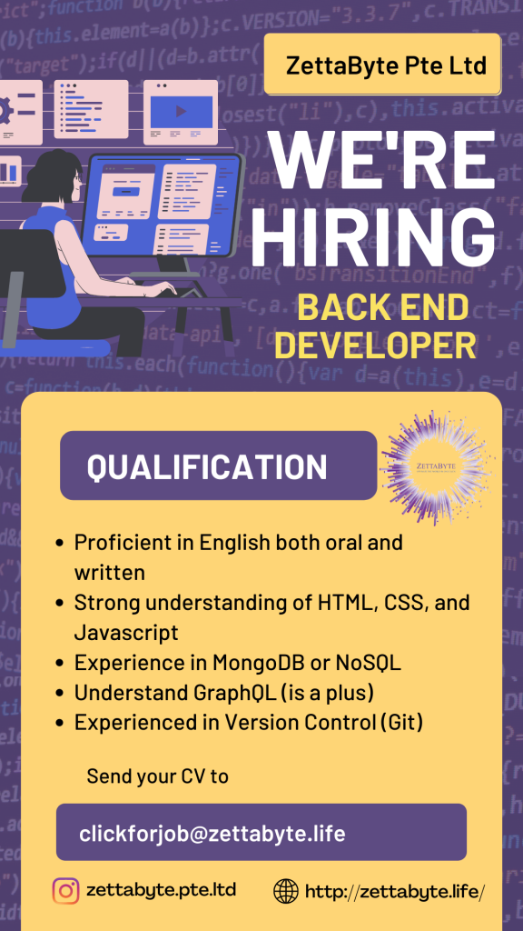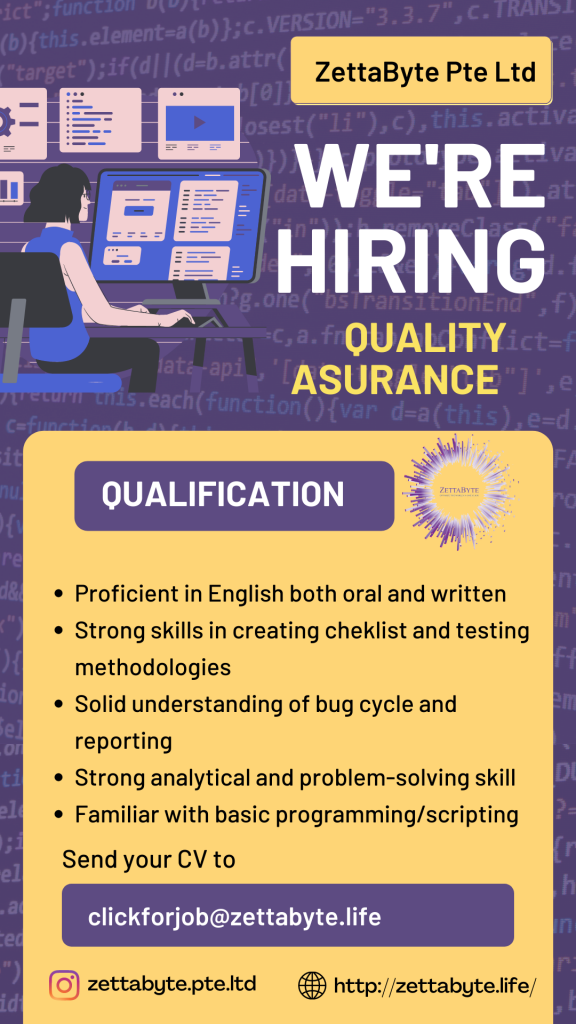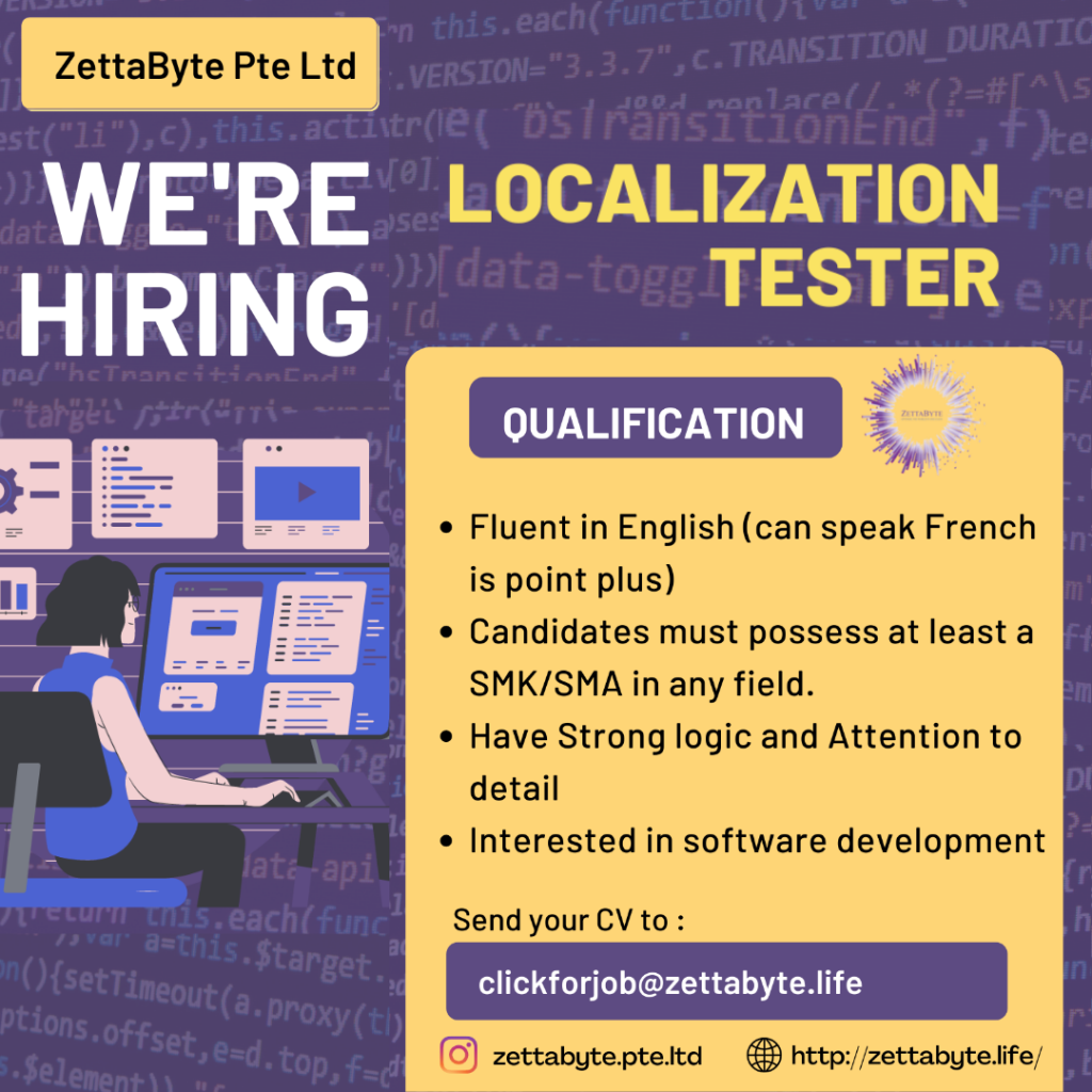 Info lowongan pekerjaan di ZettaByte Pte Ltd. Posisi yang dibutuhkan:1. QUALITY ASSURANCE2. FRONT END DEVELOPER3. BACK END DEVELOPER4. LOCALIZATION TESTER